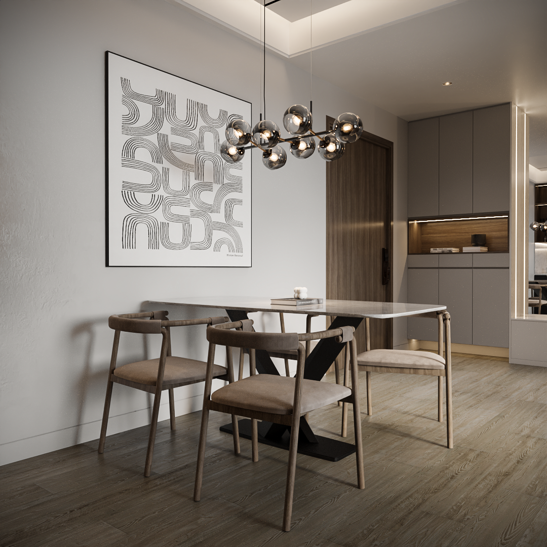 Bài toán của chung cư hiện đại là kết nối không gian. MAIHOME đã giải quyết điều này bằng một thiết kế mở hoàn toàn, nơi phòng khách – phòng ăn – bếp “chảy” vào nhau một cách mượt mà.