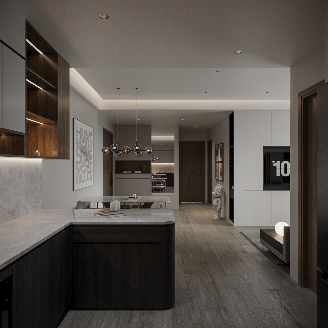 • Điểm nhấn tương phản: Các hộc tủ âm và kệ trang trí được ốp gỗ màu óc chó (dark wood), tạo ra sự tương phản thị giác đầy chủ ý, sang trọng và có chiều sâu.