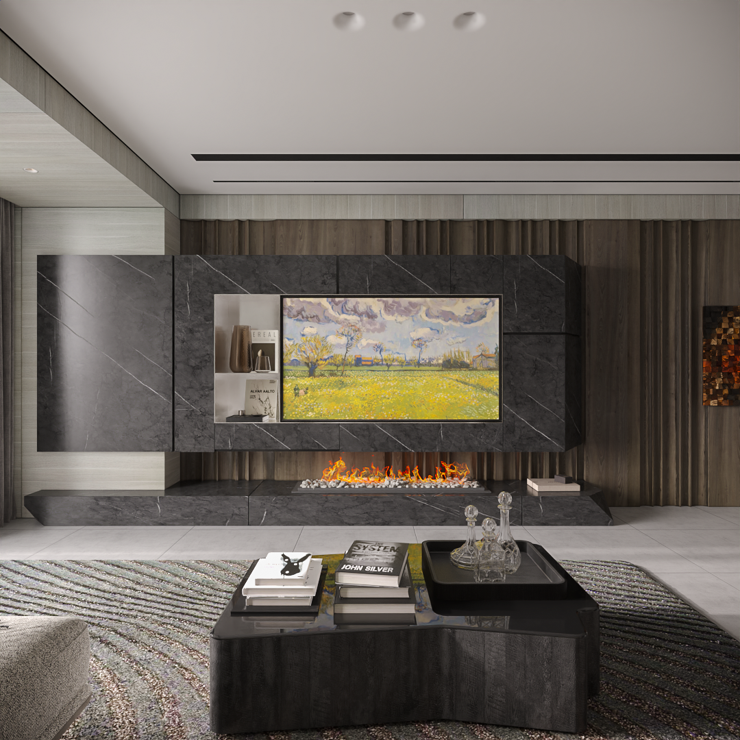 Đây chính là “linh hồn” của không gian phòng khách. MAIHOME đã thay thế một vách TV thông thường bằng một hệ thống media wall (tường giải trí) đa chức năng, ốp đá marble đen (hoặc đá nung kết) với đường vân mây trắng mạnh mẽ.