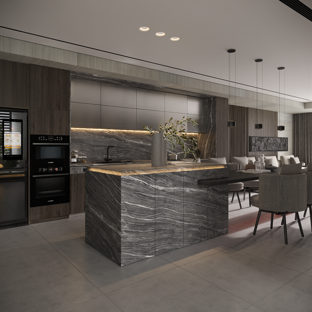 - Đảo bếp: Một khối đá marble “ton-sur-ton” với vách TV, vừa là nơi chuẩn bị đồ ăn, vừa là quầy bar mini.